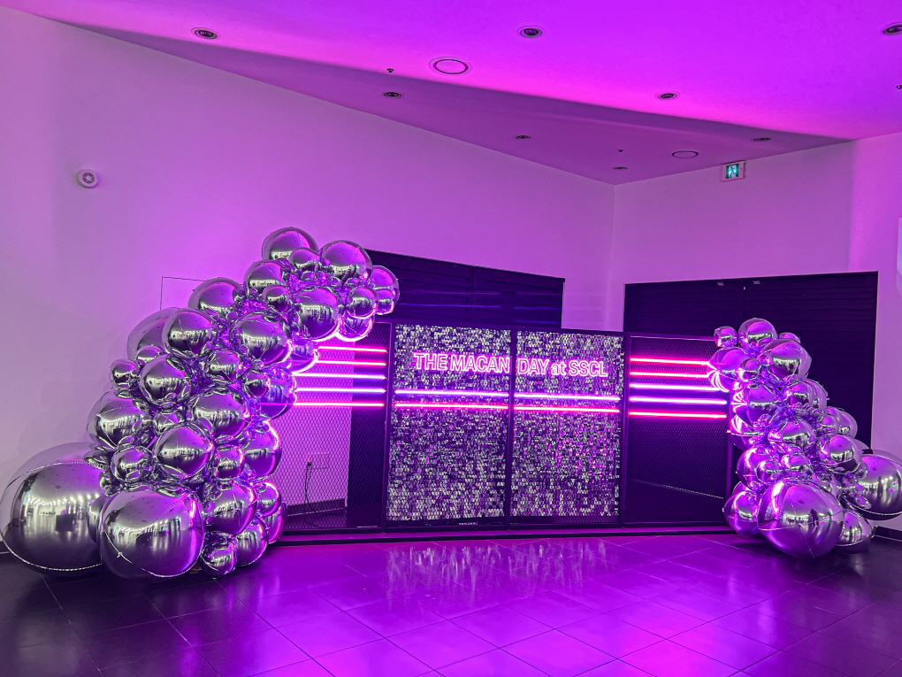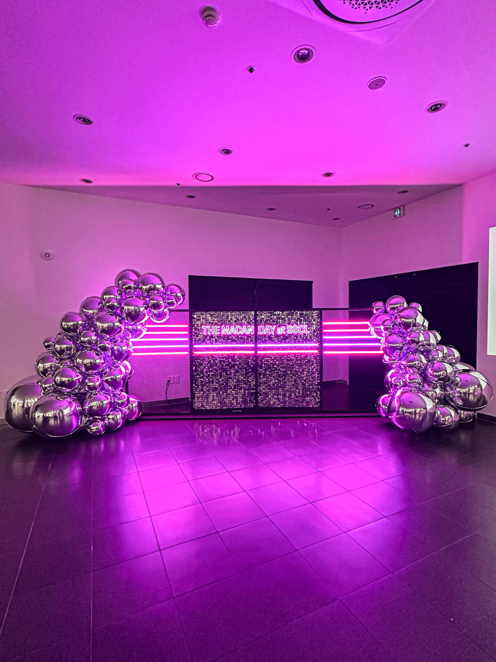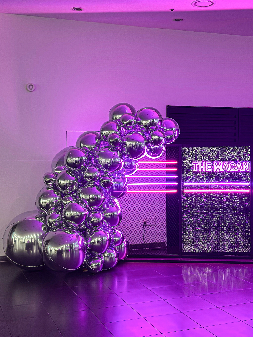 메탈릭 크롬 벌룬과 퍼플 네온 조명이 어우러진 프리미엄 브랜드 포토존입니다.