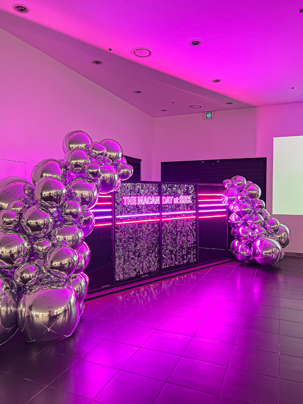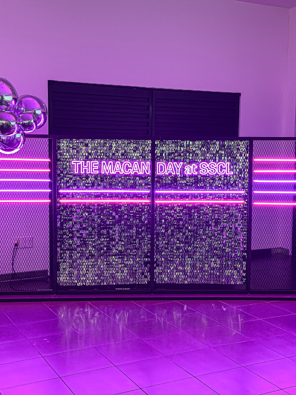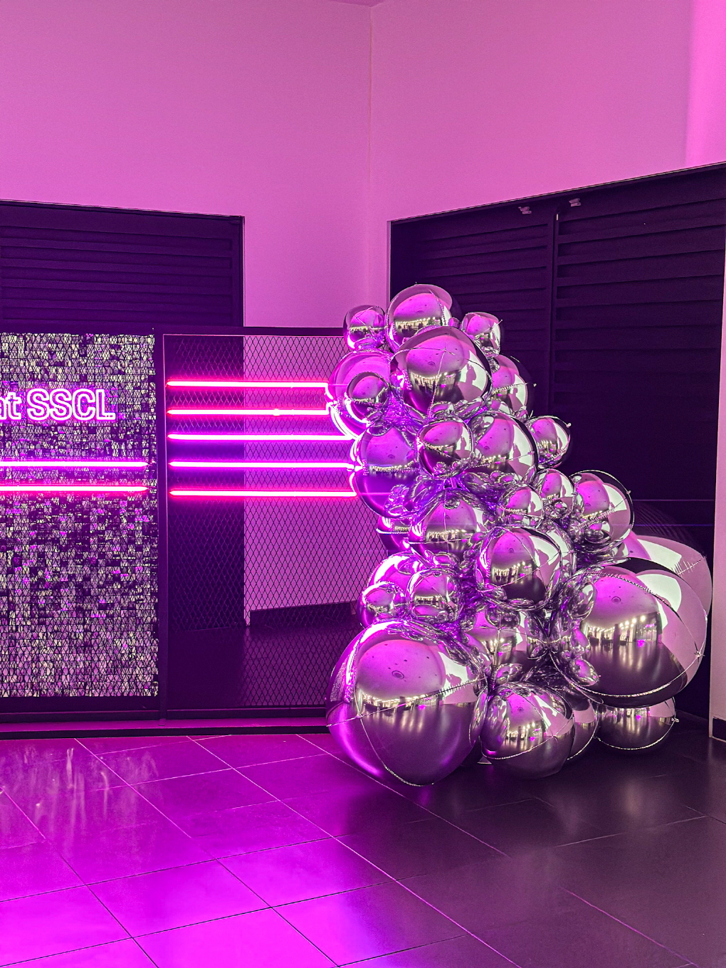 메탈릭 크롬 벌룬과 퍼플 네온 조명이 어우러진 프리미엄 브랜드 포토존입니다.