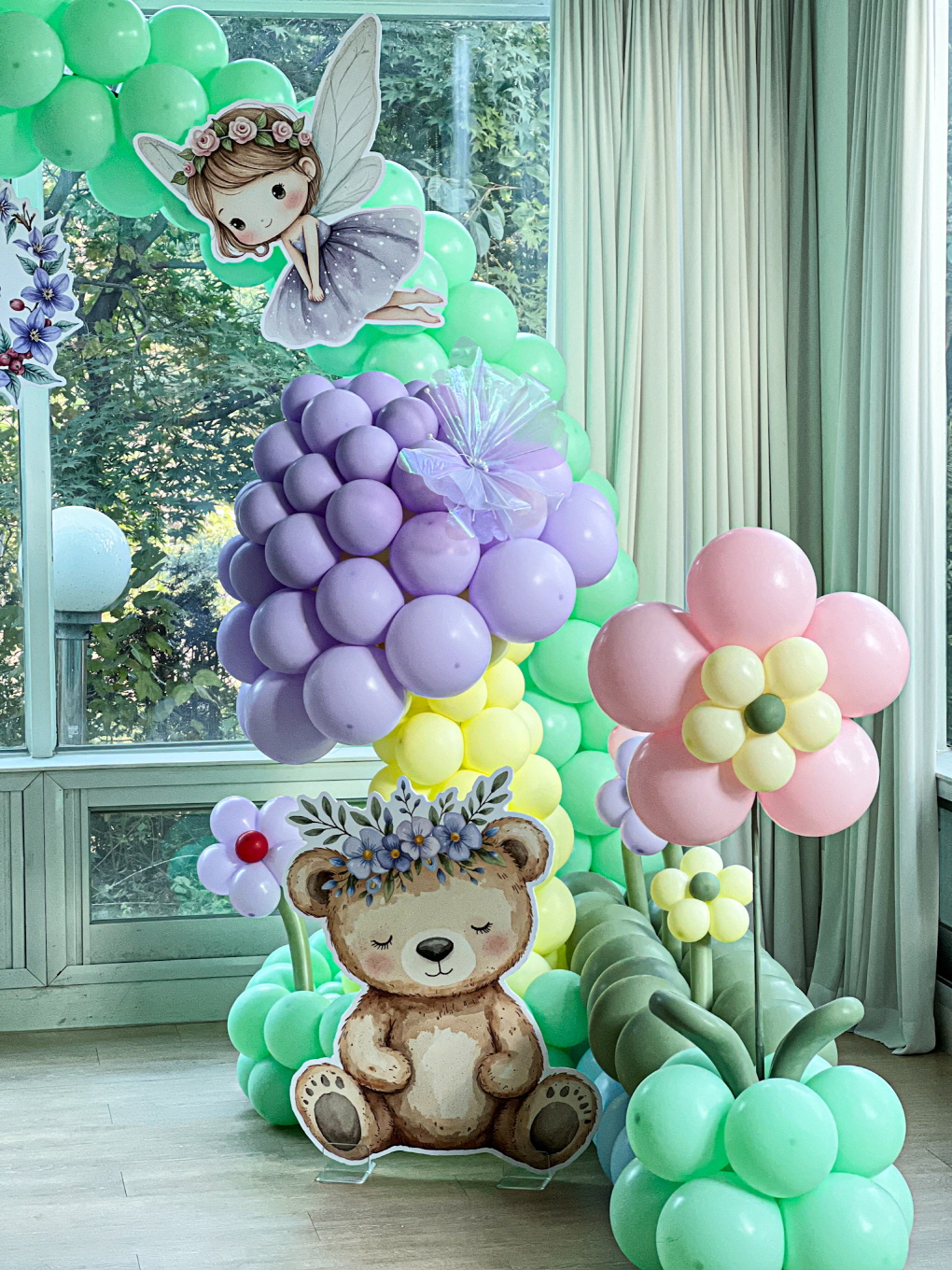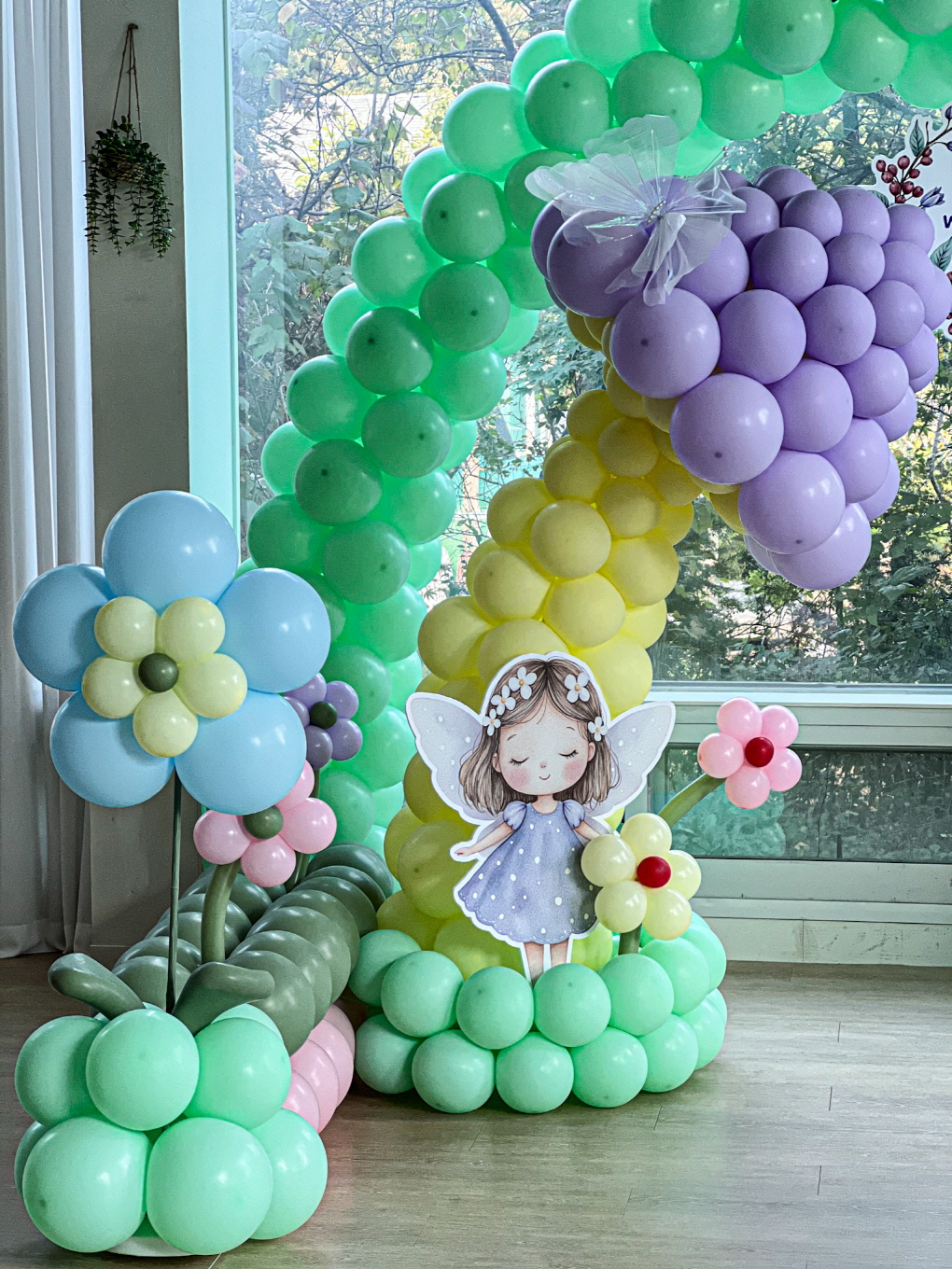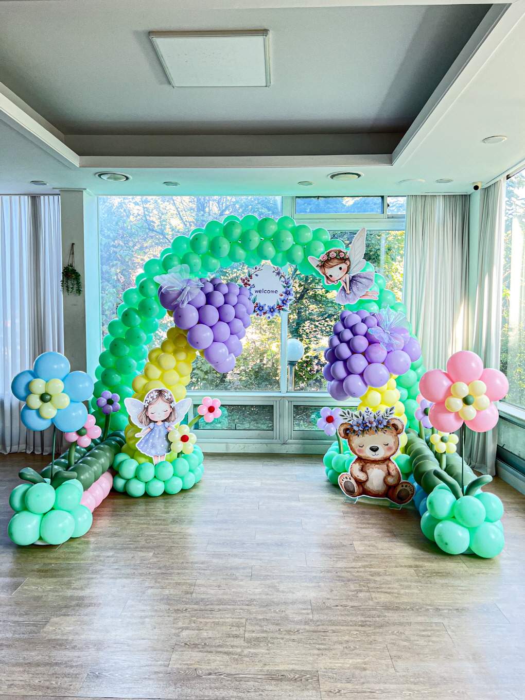 요정 캐릭터와 꽃 장식, 부드러운 파스텔 벌룬을 조합해 아이들의 상상력을 자극하는 동화 속 공간을 만들었습니다.