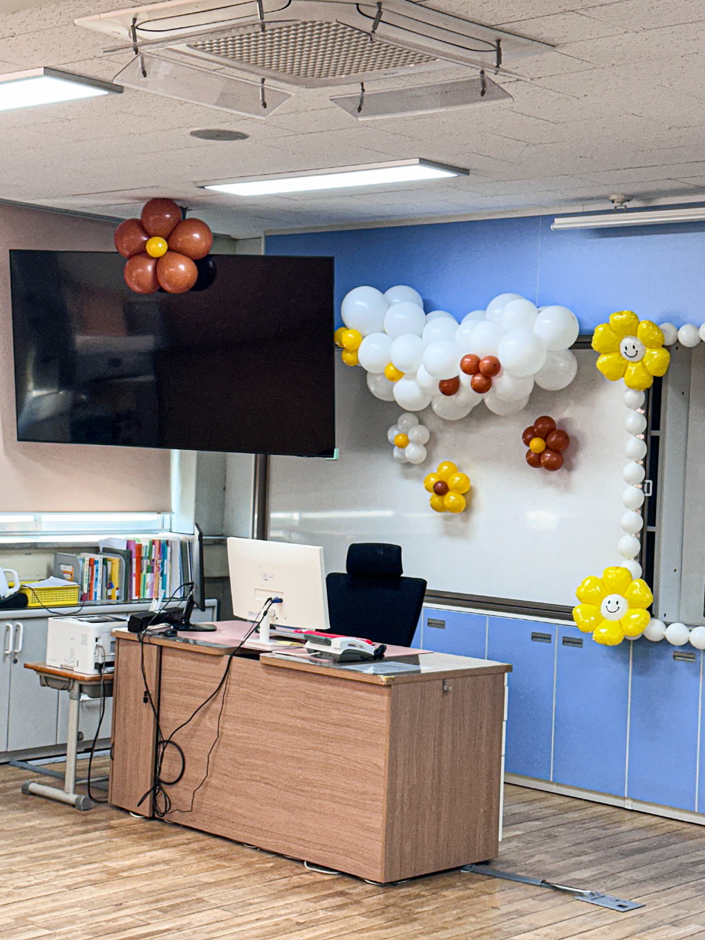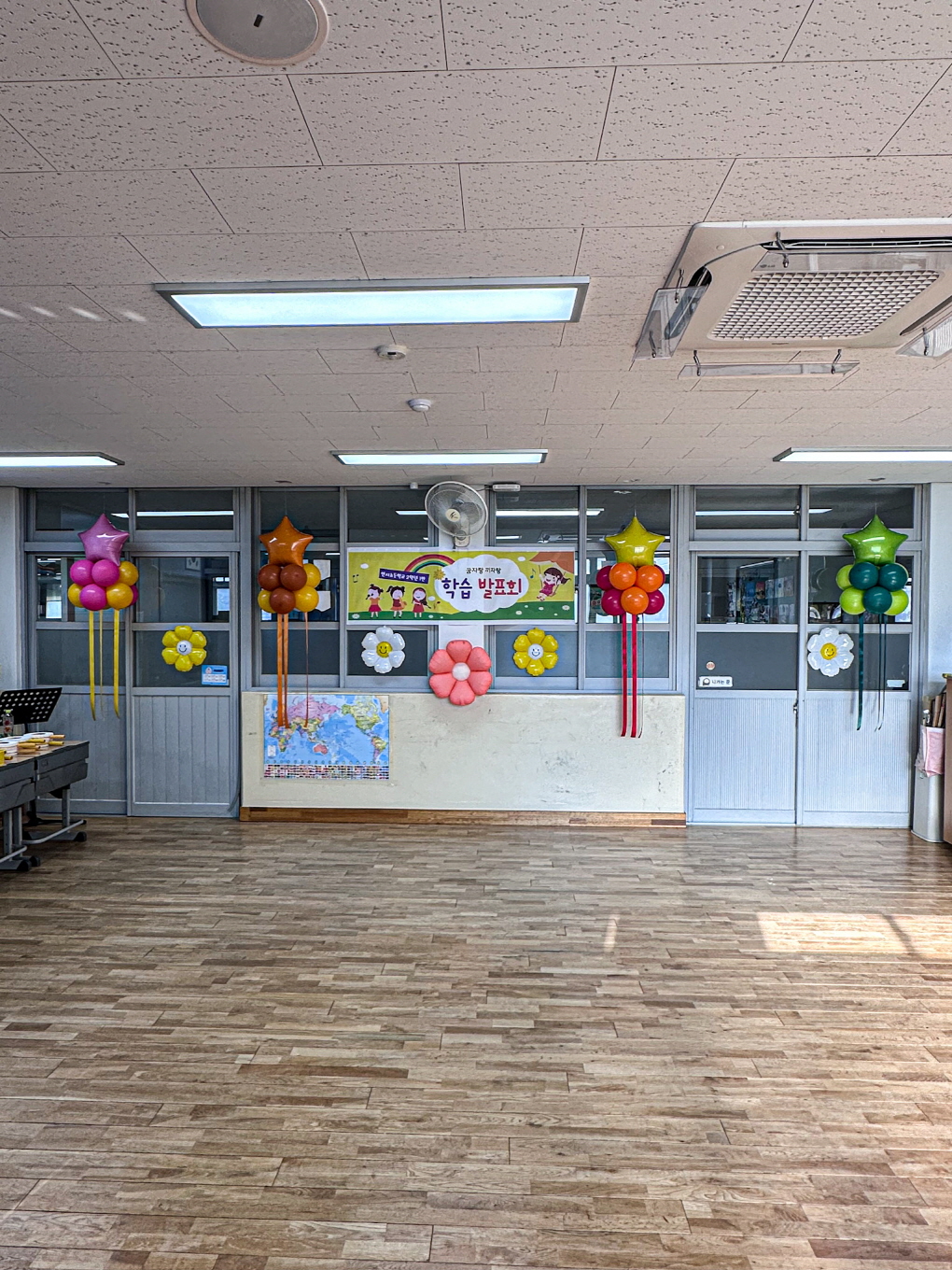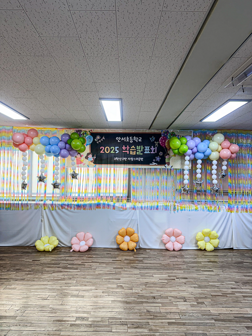 교실 전체를 다양한 색감의 꽃풍선과 가랜드로 꾸며 아이들이 더욱 설레는 학예회 분위기를 만들었습니다.