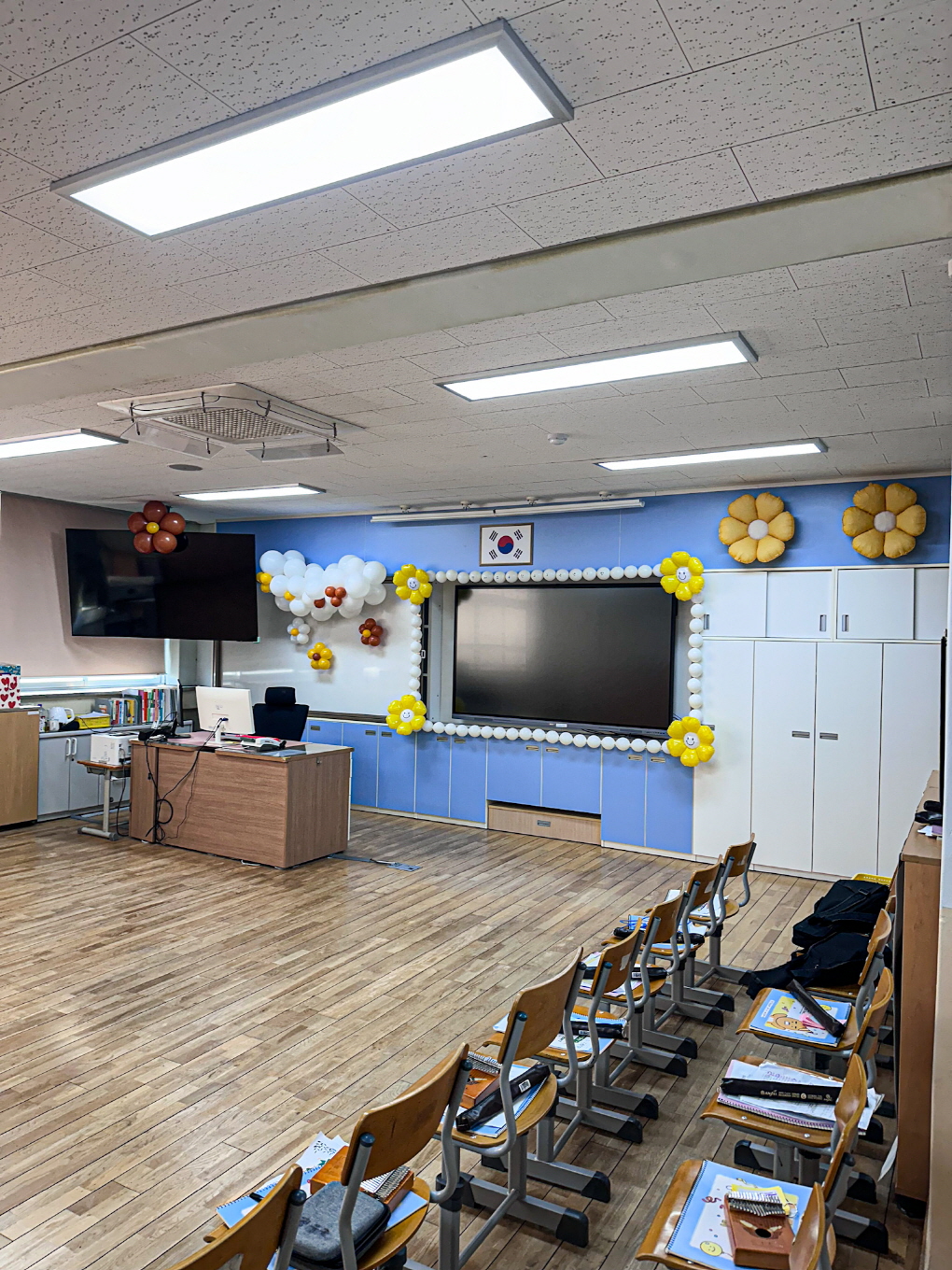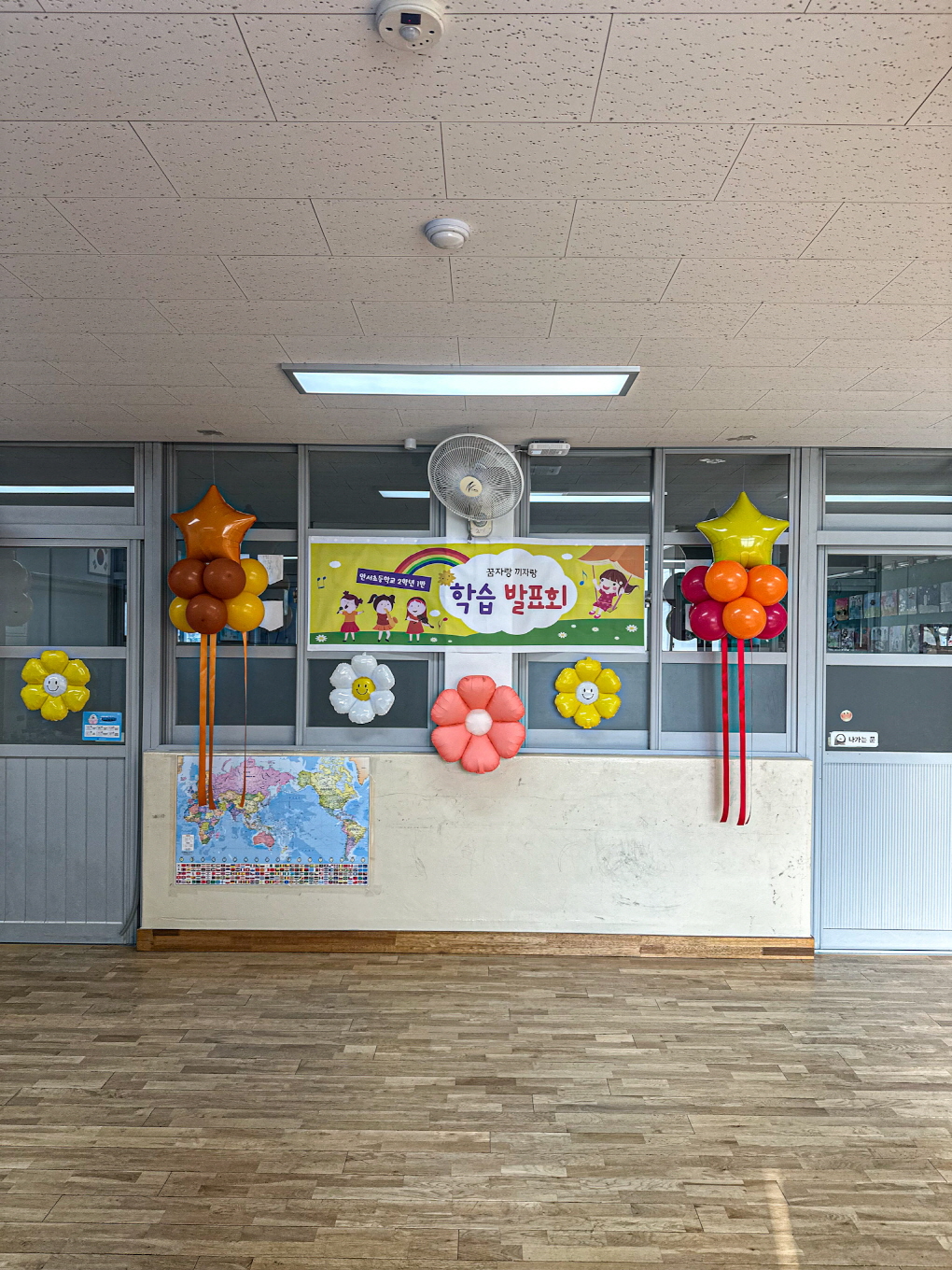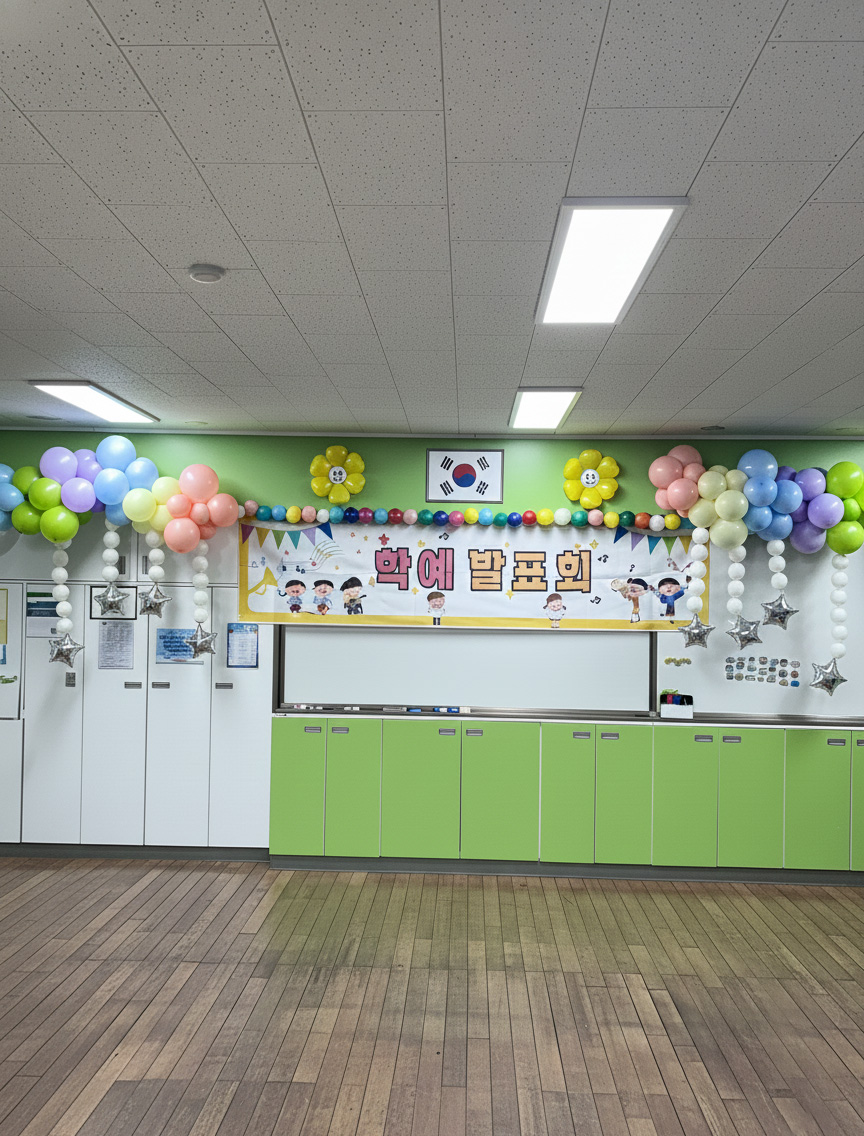 교실 전체를 다양한 색감의 꽃풍선과 가랜드로 꾸며 아이들이 더욱 설레는 학예회 분위기를 만들었습니다.